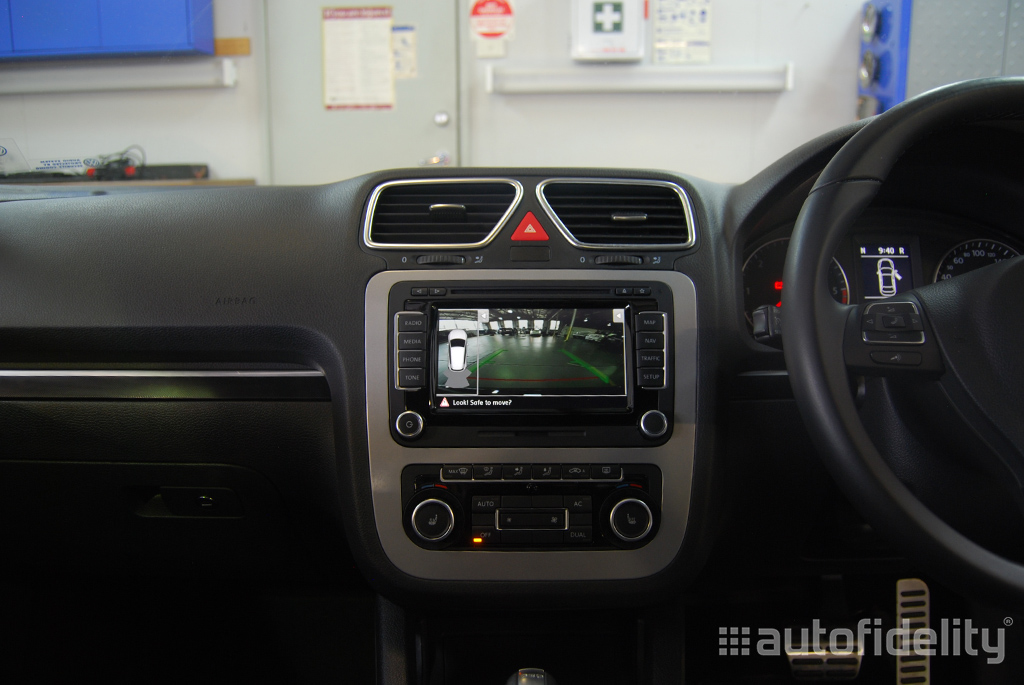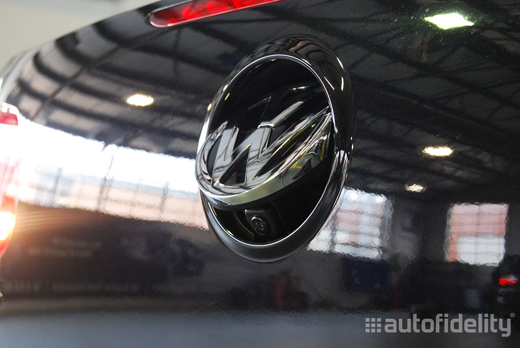 Integrated rear view camera using factory VW emblem camera. Camera view is automatically displayed on centre display screen when reverse is activated. Features include: High quality CCD image sensor, 0.01 lux minimum illumination, 170 degree viewing angle and full colour camera.