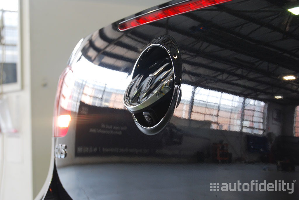 - Camera is hidden behind the rear emblem badge cover and is only noticeable when vehicle is in reverse gear